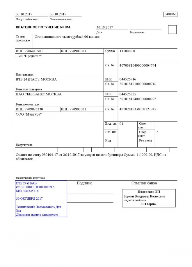 Оплачен счет за печать сборника медицинских статей о лечении миелодисплазии у детей