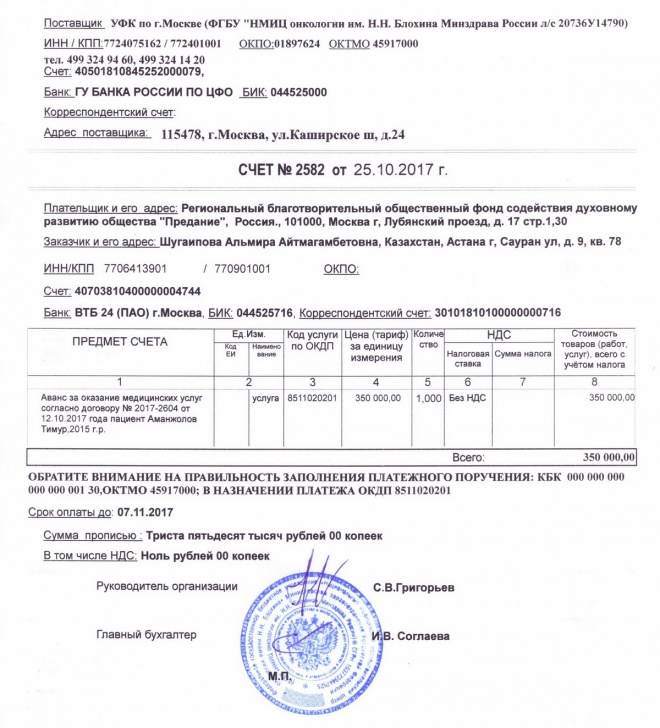 Оплачен счет за проведение курса химиотерапии Тимуру Аманжолову. Оставшиеся средства возвращены на счет фонда