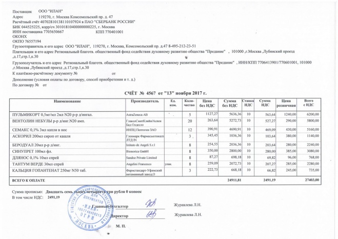 Пожертвование согласно ст.582 ГК РФ. Без налога (НДС)