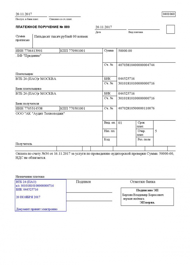 Оплачен счет за услуги по проведению аудиторской проверки деятельности фонда в 2016 году