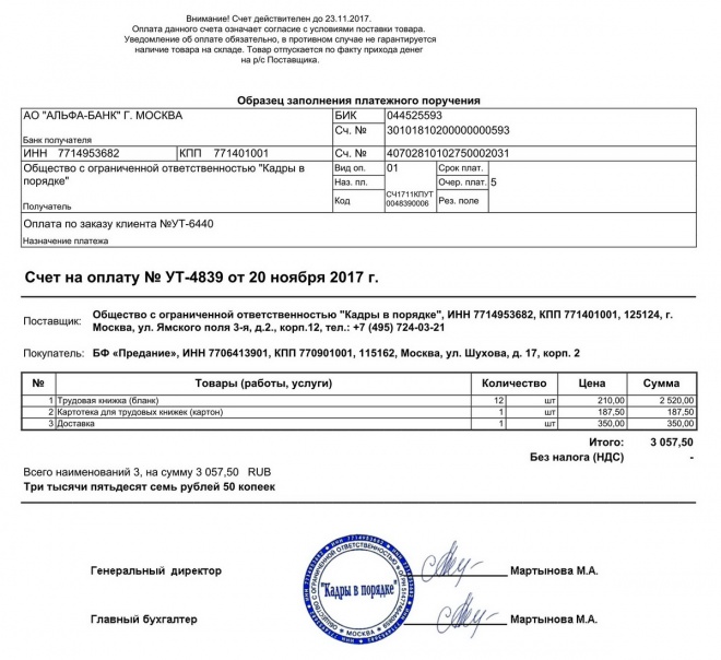 Оплачена покупка бланков трудовых книжек и картотеки для них