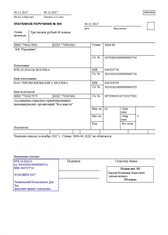 Перечислены членские взносы за ноябрь 2017 года в благотворительное собрание "Все вместе"