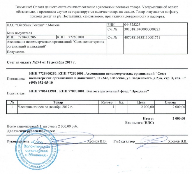 Перечислены членские взносы за декабрь 2017 года в "Союз волонтерских организаций и движений"