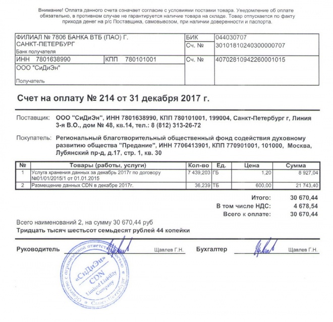 Оплачен счет за размещение материалов медиатеки в "облачном сервисе" в декабре 2017 г.