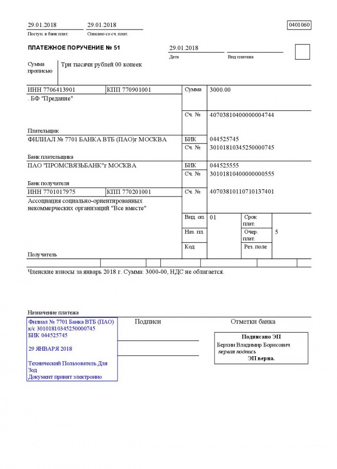 Перечислены членские взносы за январь 2018 года в благотворительное собрание "Все вместе"