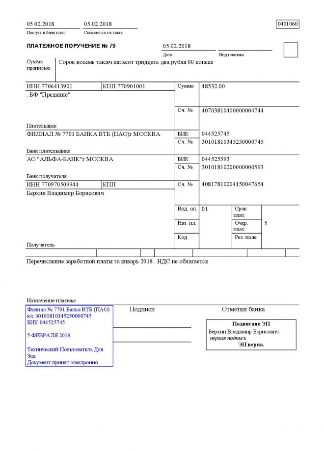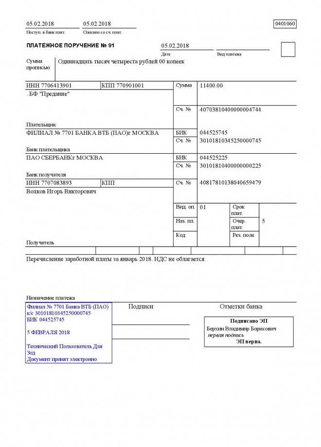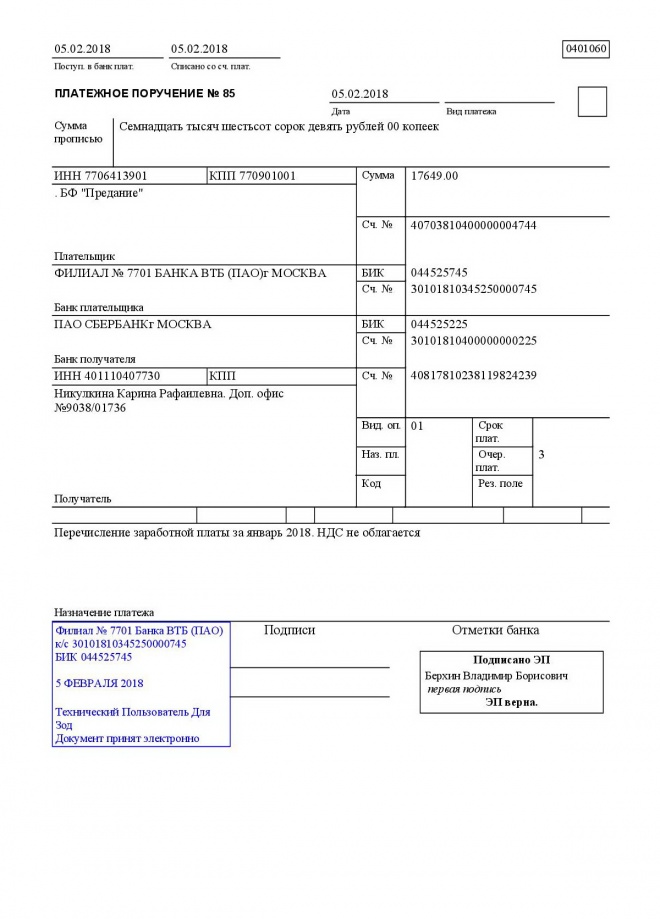 Перечисление заработной платы сотрудникам за январь 2018 г.
