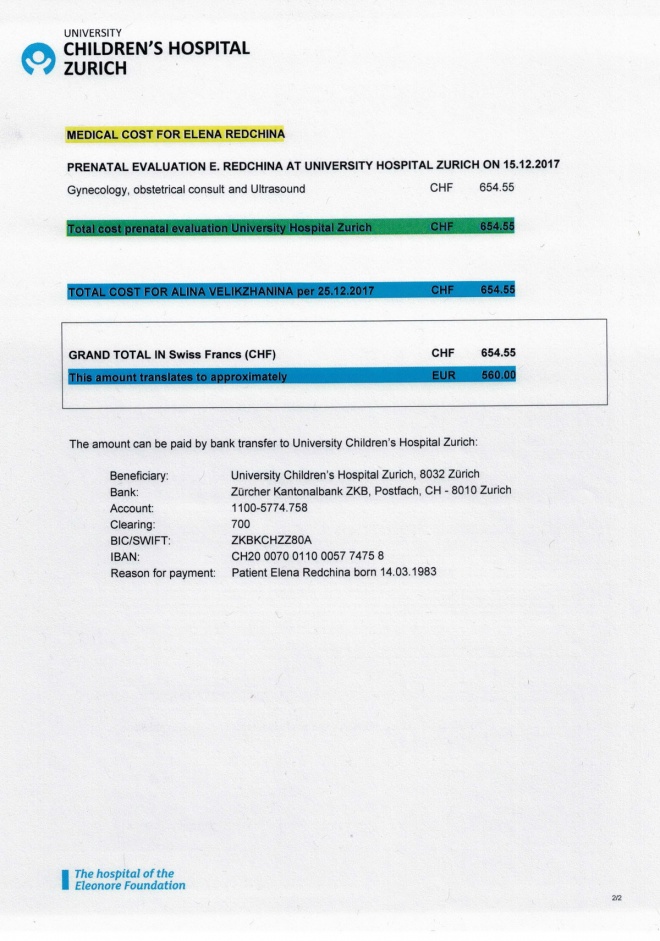 Оплачен первый счет за обследование Елены Редчиной в клинике г. Цюрих