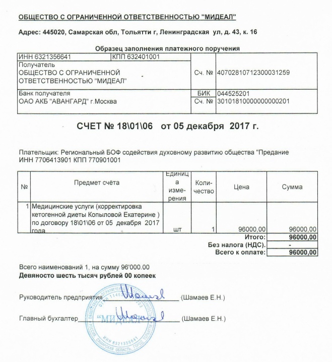 Оплачен счет за корректировку кетогенной диеты Кате Копыловой в клинике "Мидеал" г. Тольятти