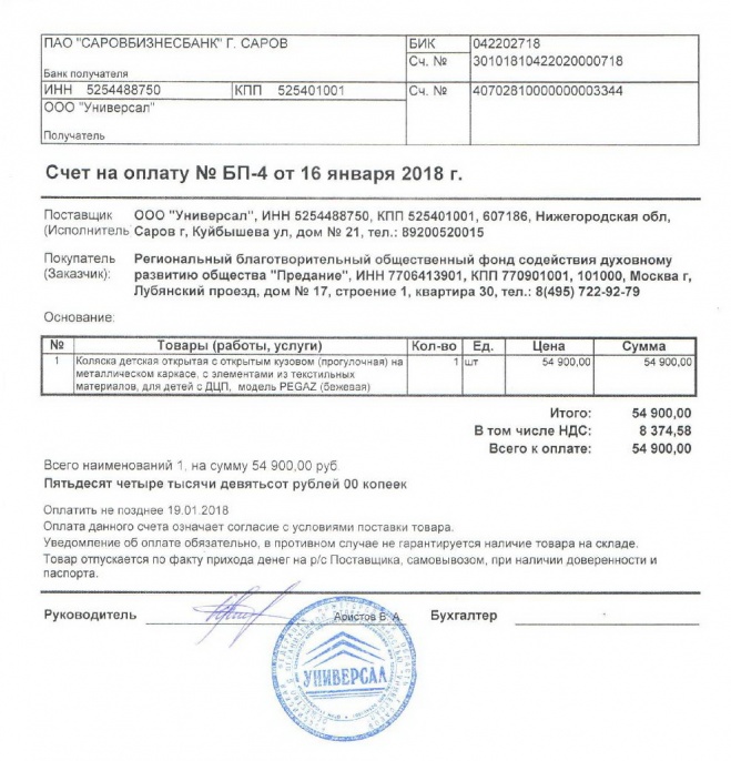 Пожертвование согласно ст.582 ГК РФ. Без налога (НДС)
