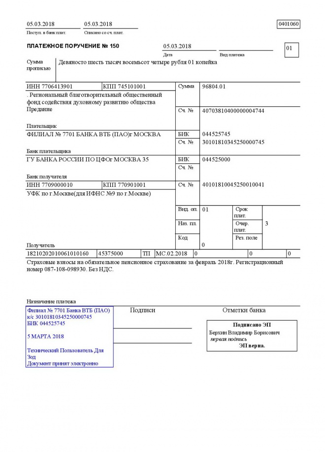 Перечисление налогов и взносов за февраль 2018 г.