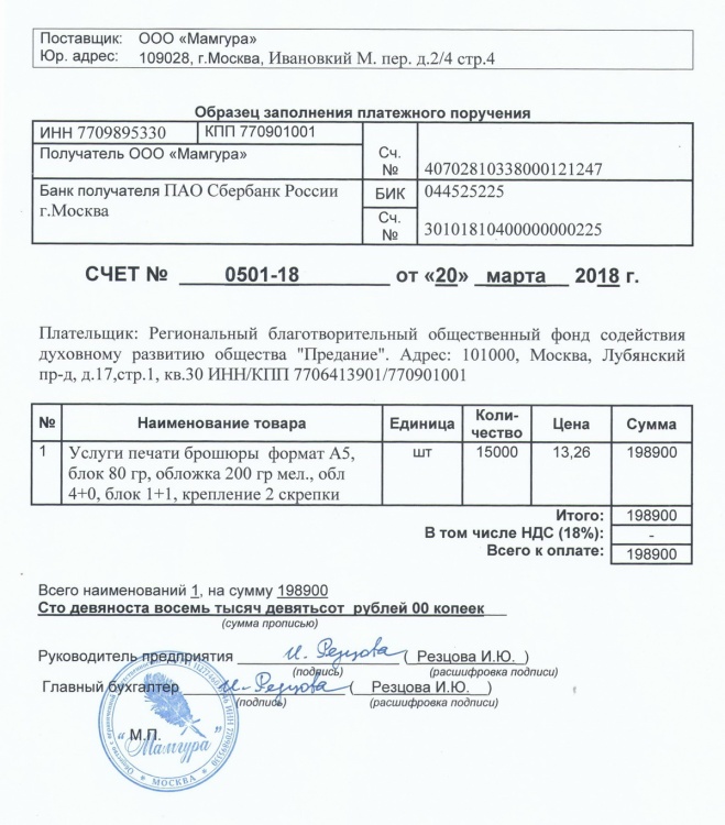 Оплачен счет за печать тиража брошюры "Справочник бездомного - 2018".