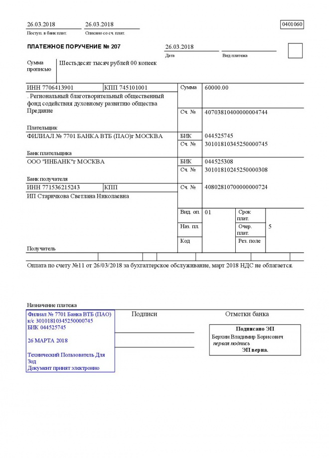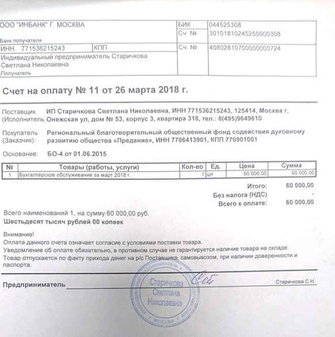 Оплачен счет за бухгалтерское обслуживание портала "Предание" в марте 2018 года