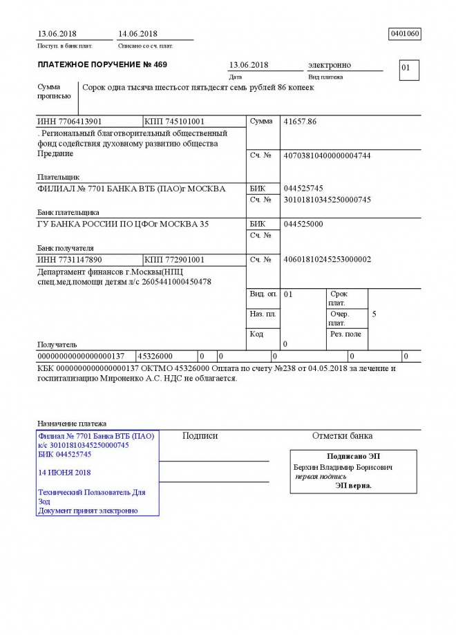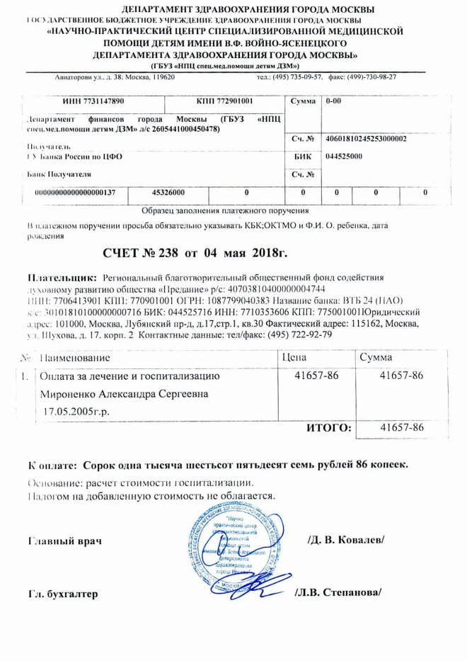 Оплачен счет за госпитализацию и лечение Саши Мироненко в НПЦ специализированной медицинской помощи детям