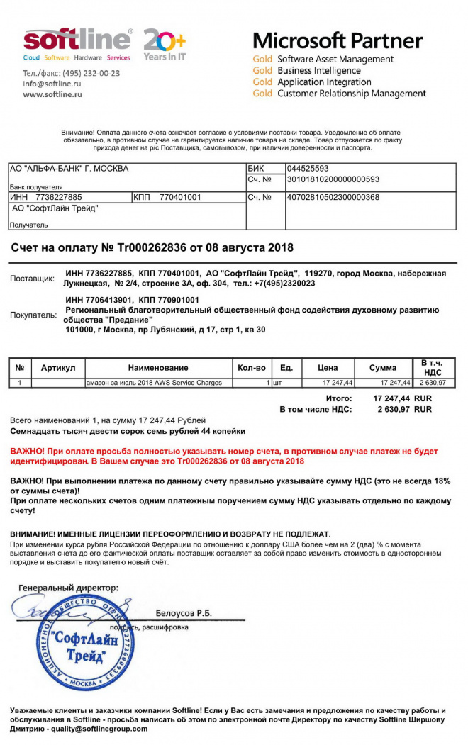 Оплачен счет за размещение наших видеоматериалов в "облачном сервисе" в июле 2018 г.