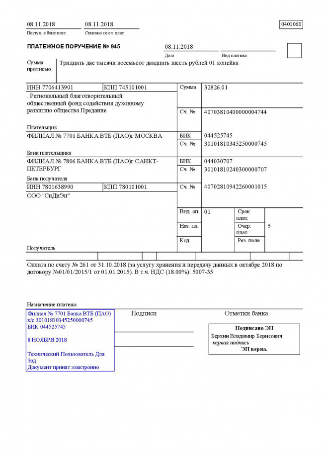 Оплачен счет за размещение материалов медиатеки в "облачном сервисе" в октябре 2018 г.