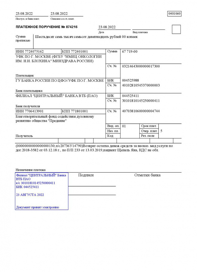 Переведены средства за лечение Яны Щепель в онкологическом центре им. Н.Н. Блохина. Неизрасходованные средства возвращены на счет фонда