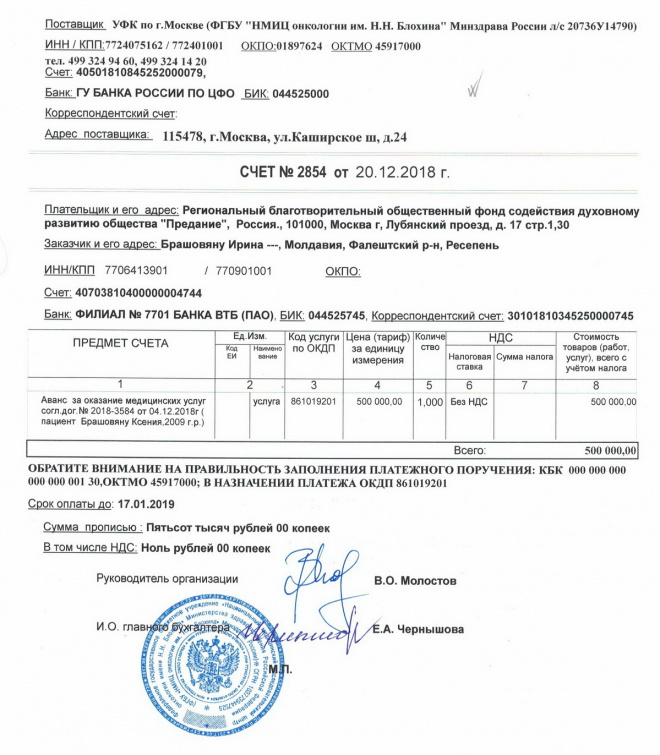 Оплачен счет за лечение Ксении Брашовяну в онкологическом центре им. Н.Н. Блохина