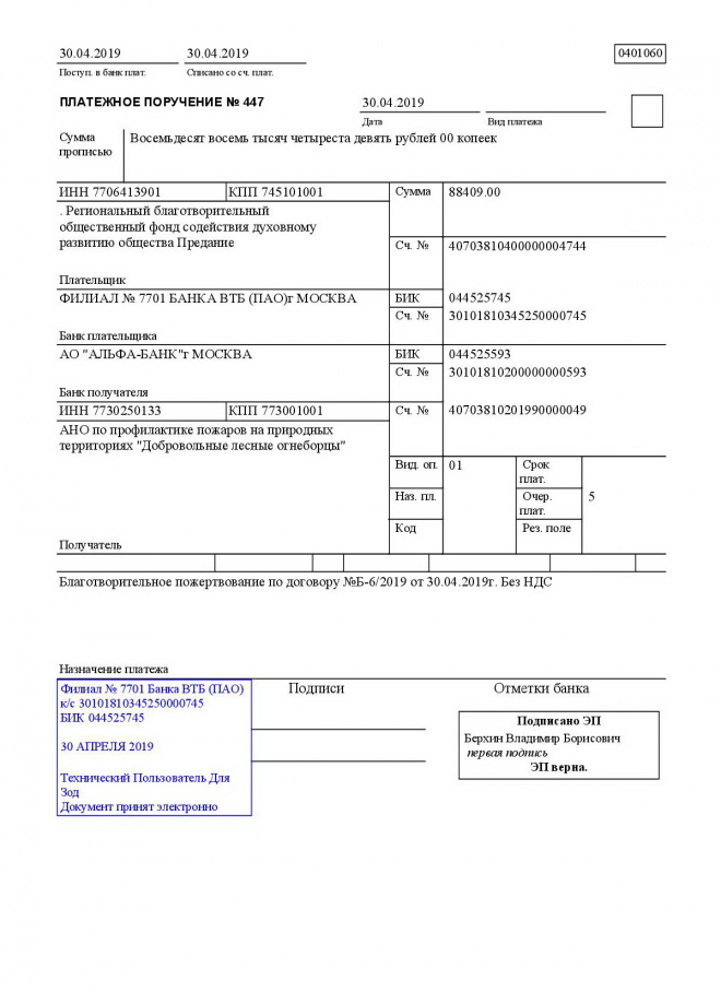 Перевод средств пожарным добровольцам Центральной России