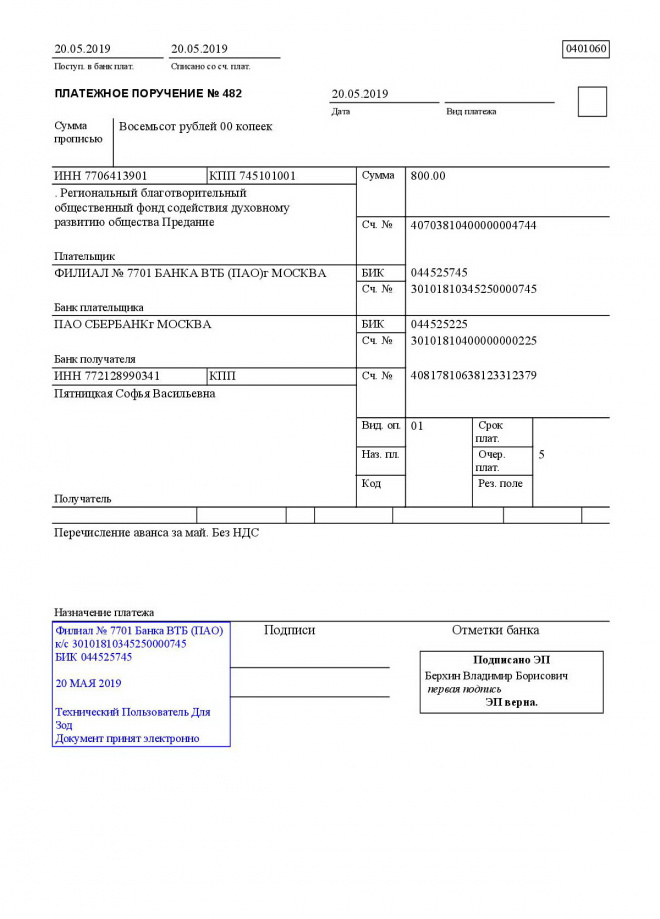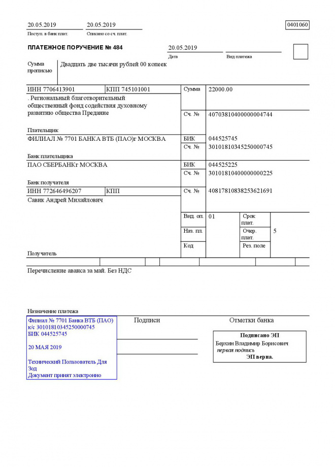 Перечислен аванс по заработной плате сотрудникам за май 2019 г.