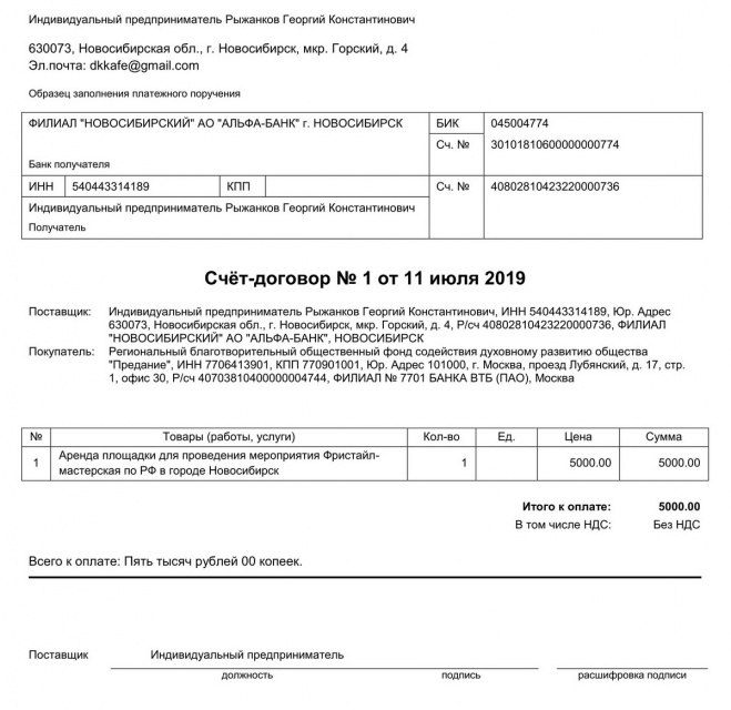 Оплачен счет за аренду площадки для проведения мероприятия "Фристайл-мастерская" в г. Новосибирск