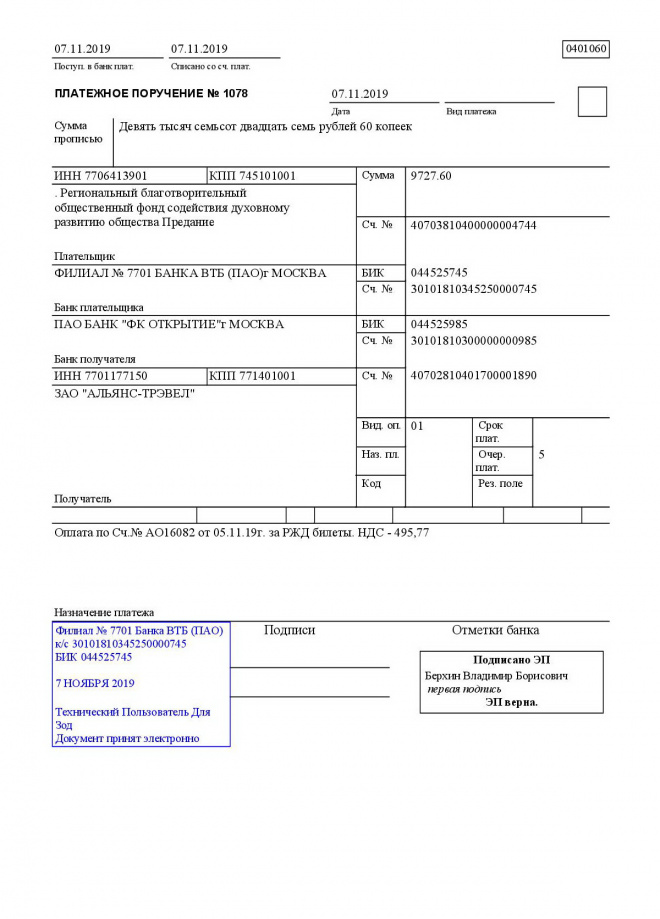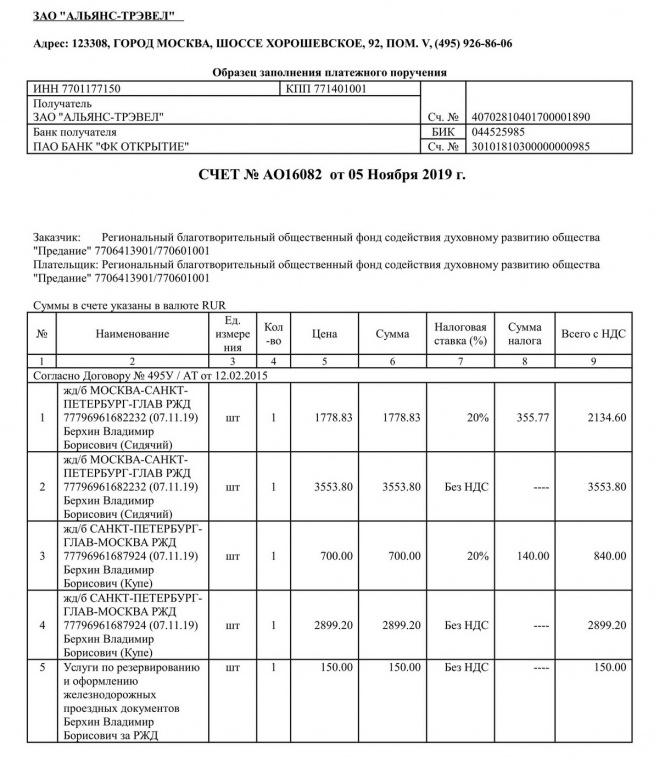 Куплены билеты Москва-Санкт-Петербург-Москва президенту фонда Владимиру Берхину