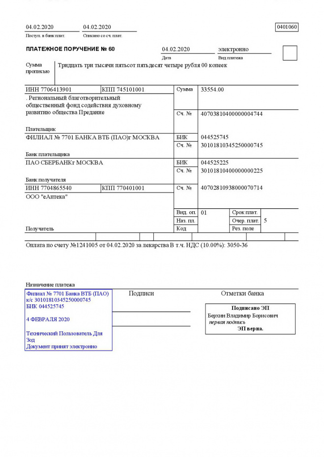 Пожертвование согласно ст.582 ГК РФ. Без налога (НДС)