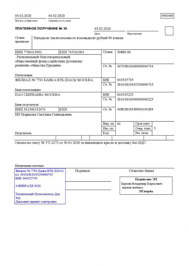 Пожертвование согласно ст.582 ГК РФ. Без налога (НДС)