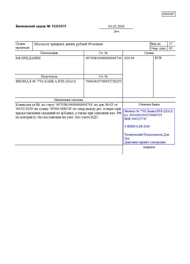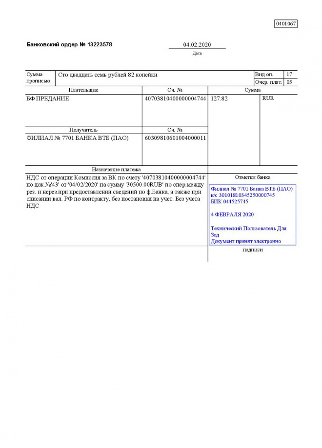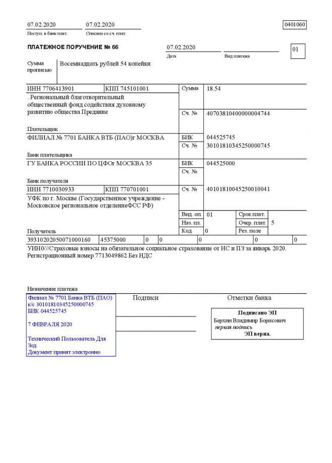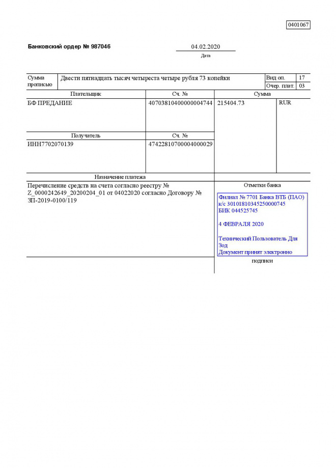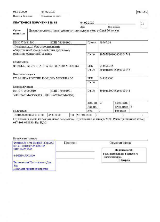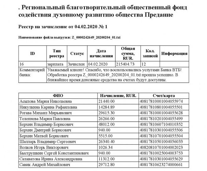 Перечисление заработной платы сотрудникам за январь 2020 г.