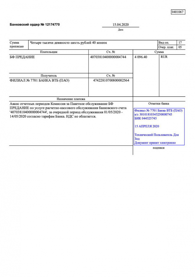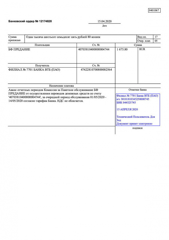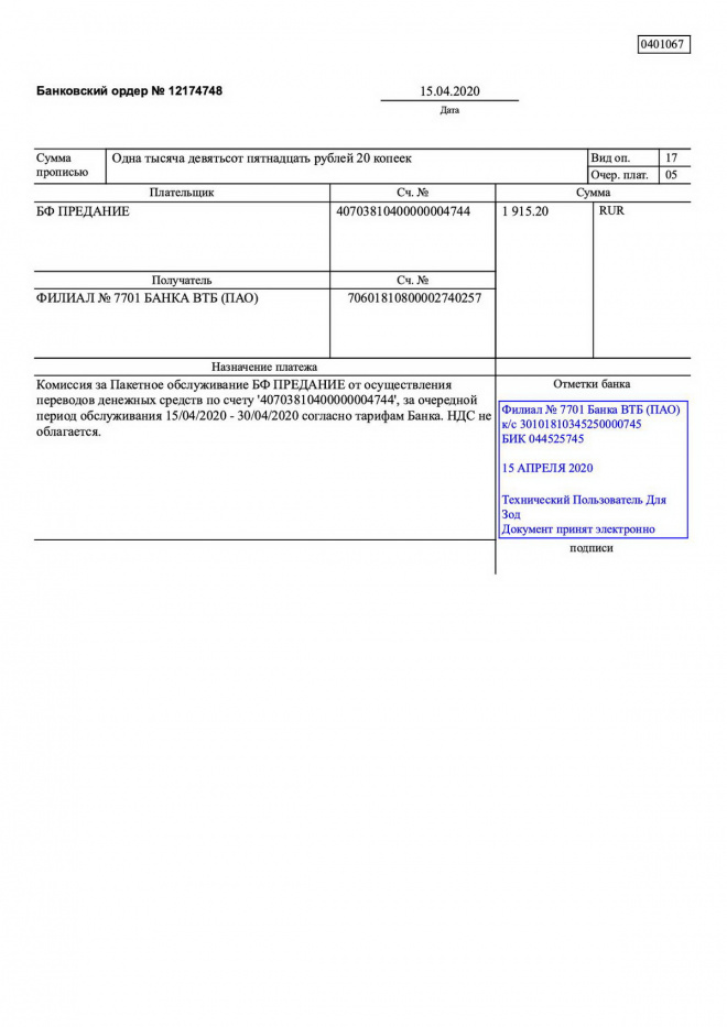 Комиссии по обслуживанию наших банковских счетов в апреле 2020 г.