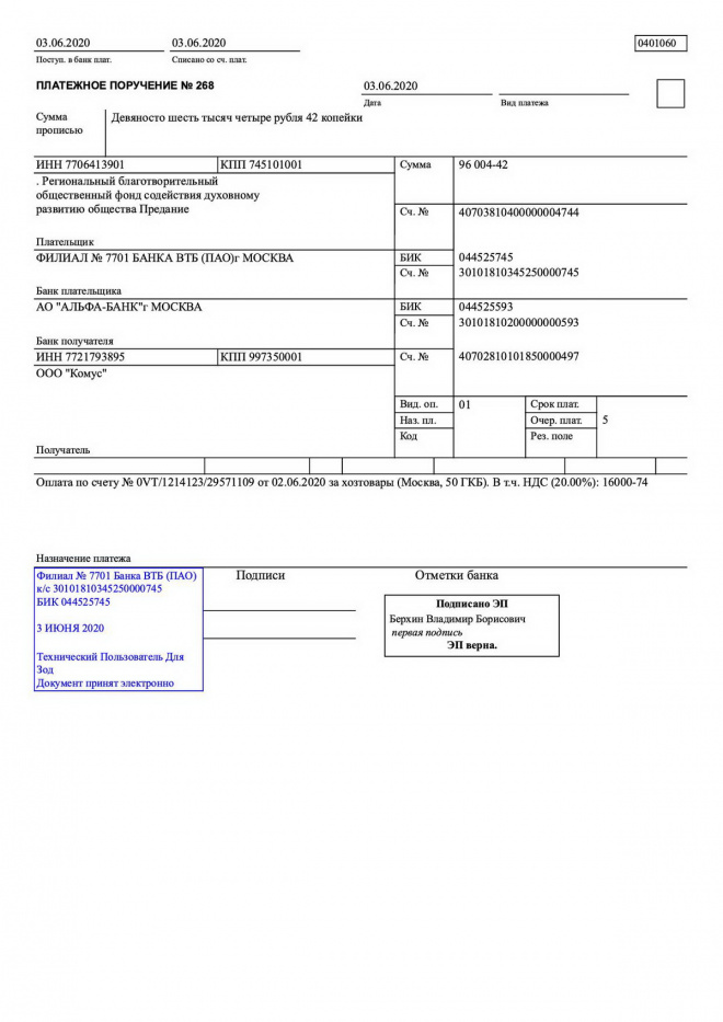 Оплачена покупка хозяйственных товаров для Городской клинической больницы № 50 г. Москвы