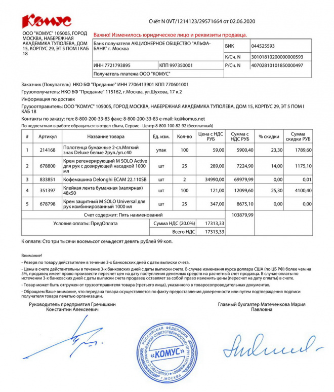 Оплачена покупка хозяйственных товаров для МГМУ им. И.М. Сеченова