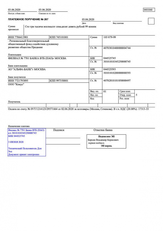 Пожертвование согласно ст.582 ГК РФ. Без налога (НДС)