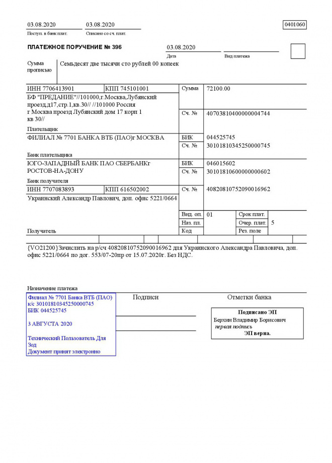 Перечисление заработной платы сотрудникам за июль 2020 г.