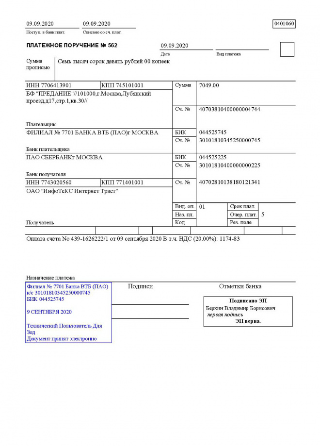 Оплачен счет за срочное изготовление сертификата электронной подписи