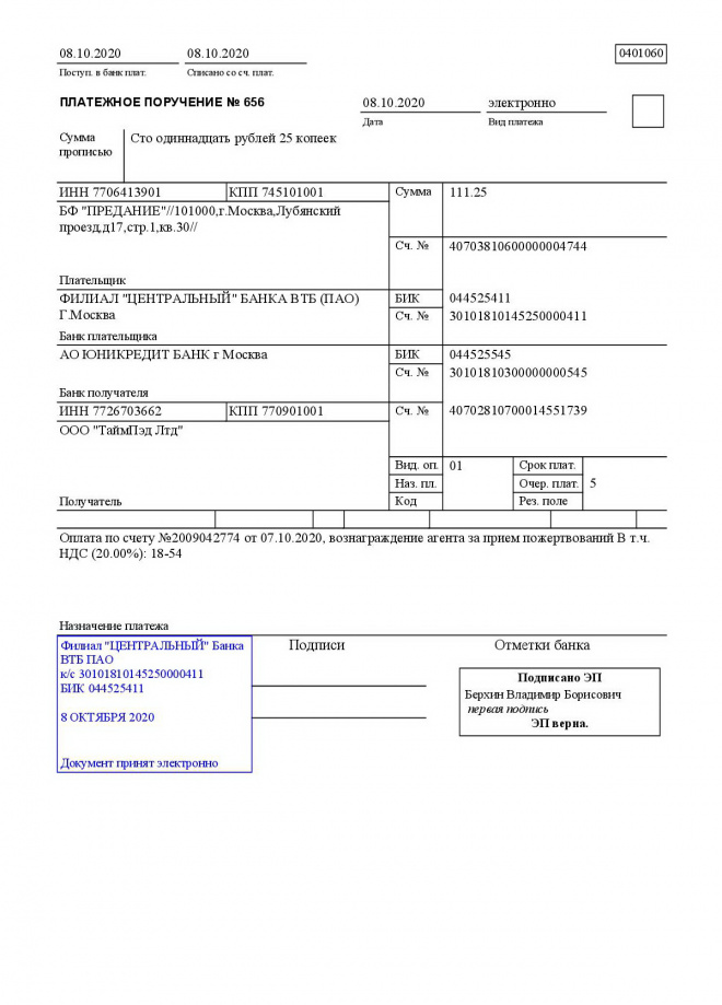 Оплачена комиссия за услуги сервиса "ТаймПэд", помогавшего нам с организацией лекций в сентябре 2020 г.