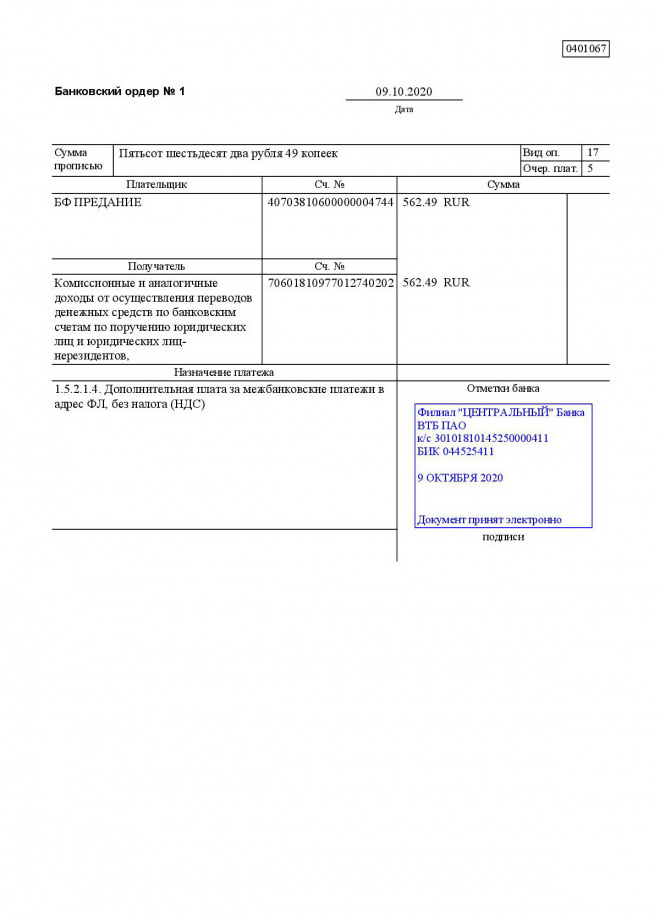 Пожертвование согласно ст.582 ГК РФ. Без налога (НДС)