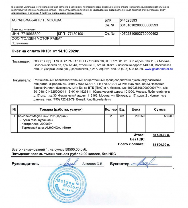 Пожертвование согласно ст.582 ГК РФ. Без налога (НДС)