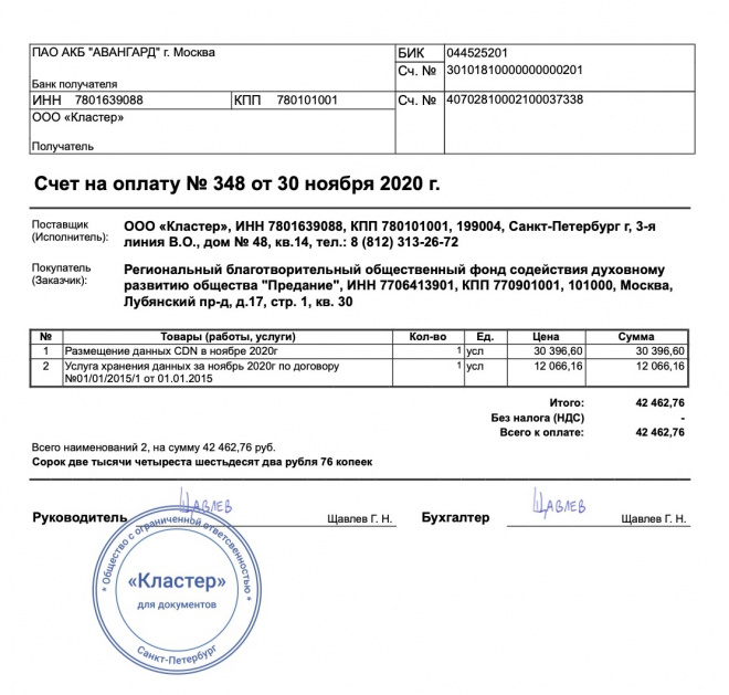 Оплачен счет за размещение материалов медиатеки в "облачном сервисе" в ноябре 2020 г.