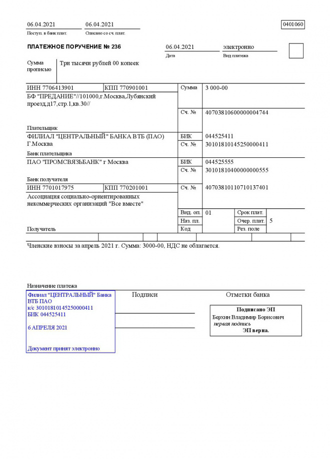 Перечислены членские взносы за апрель 2021 года в благотворительное собрание "Все вместе"