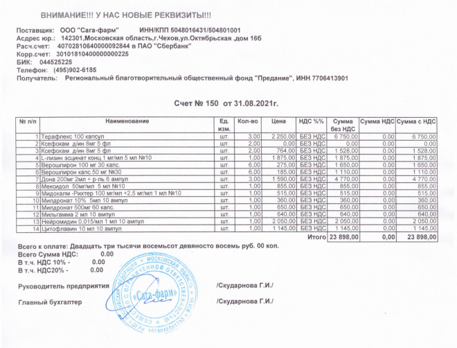 Пожертвование согласно ст.582 ГК РФ. Без налога (НДС)