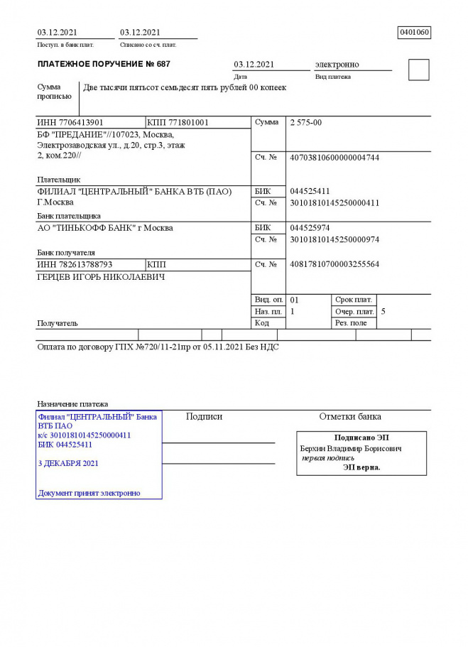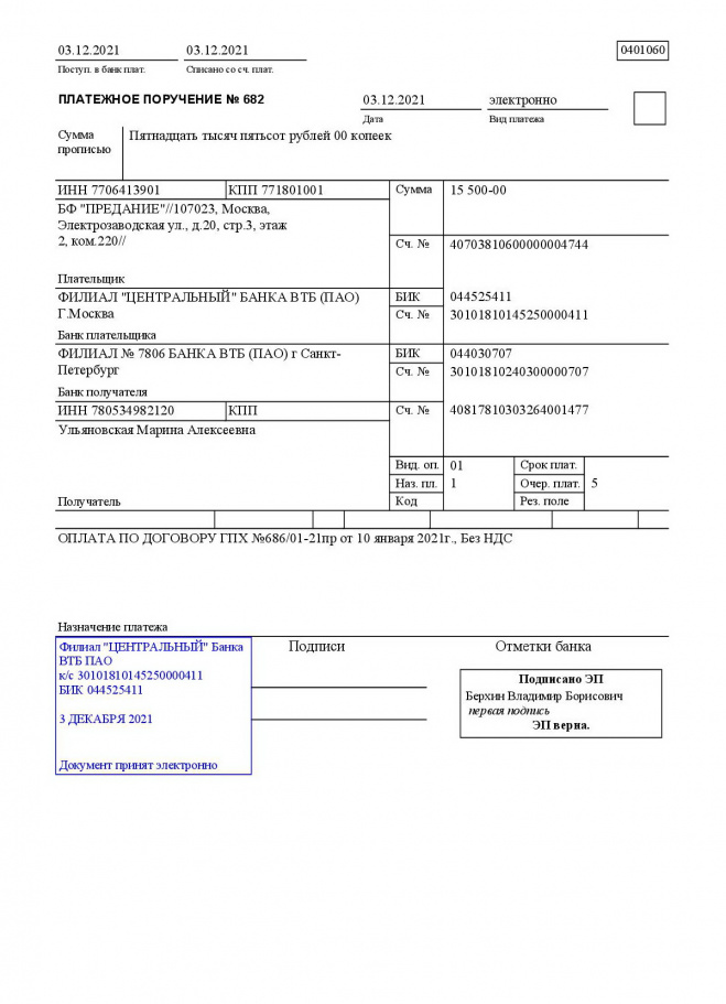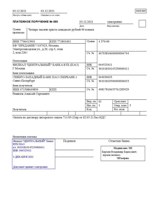 Переведены средства за написание и корректировку статей, проведение и съемку лекций в ноябре 2021 г. Игорю Николаевичу Зайцеву (лекция), Артуру Степановичу Бернацкому (лекция), Игорю Николаевичу Герцеву (лекция), Алексею Сергеевичу Ремизову (статья), Ольге Вячеславовне Лебединской (статья), Ольге Валентиновне Киселевой (статья), Дмитрию Викторовичу Сизоненко (лекция), Марине Валентиновне Михайловой (лекция), Сергею Валерьевичу Чапнину (статья), Вадиму Валентиновичу Оленину (корректировка), Марине Алексеевне Ульяновской (съемка), Ксении Анатольевне Гриньковой (статья).