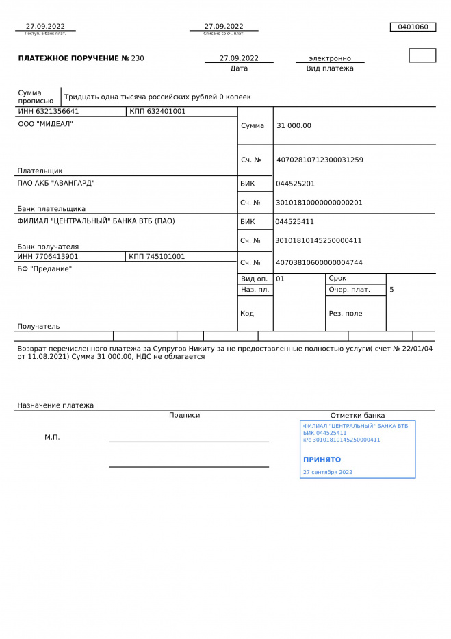 Оплачен счет за проведение корректировки кетогенной диеты Никите Супрунову в клинике "Мидеал". Неизрасходованные средства возвращены на счет фонда.