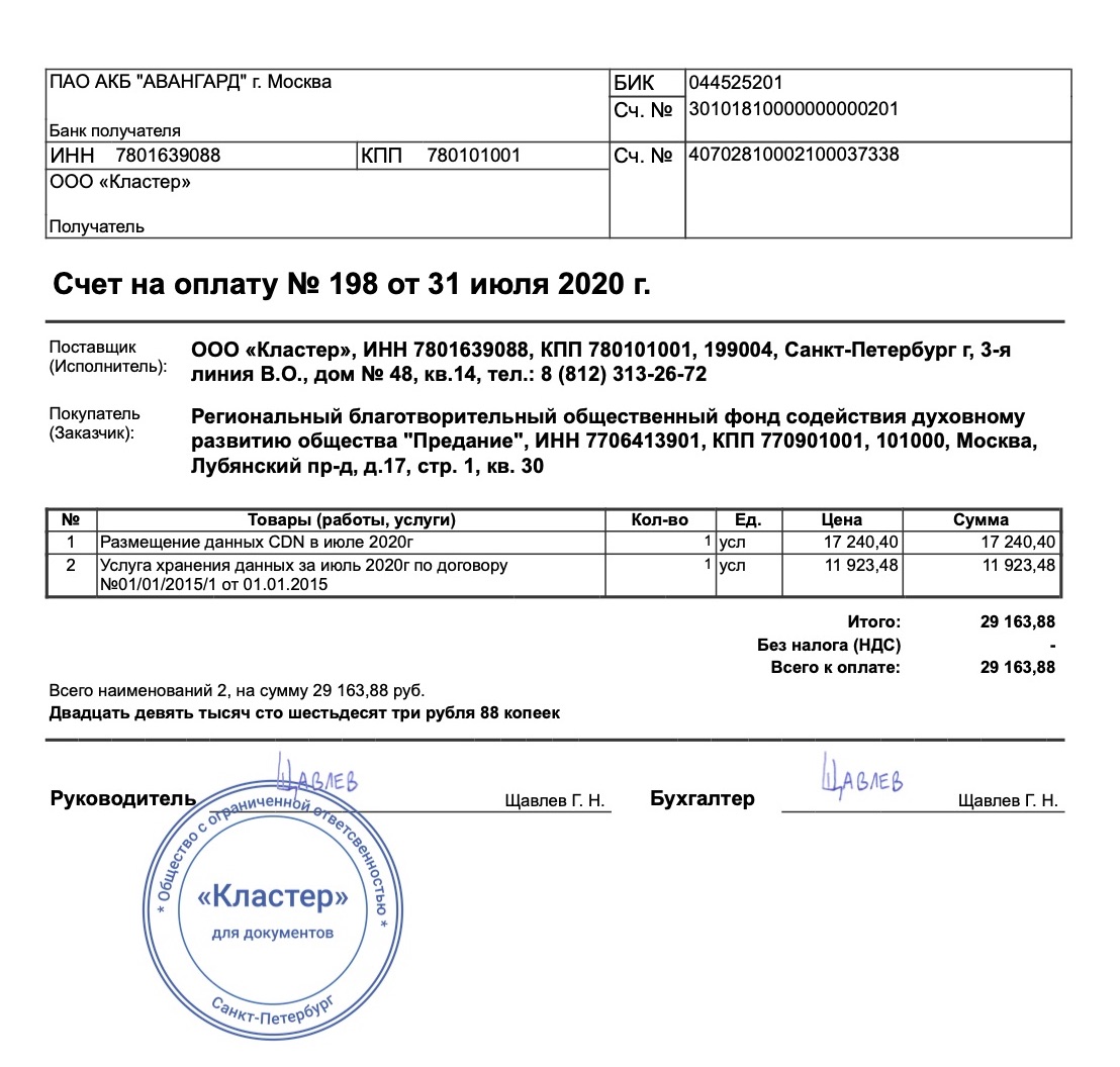 | 26.08.2020 13:08 | Расход | 60 000₽ | Выплата | Работа фонда - июль 2020 года | Оплачен счет за бухгалтерское обслуживание портала "Предание" в июле 2020 года | |