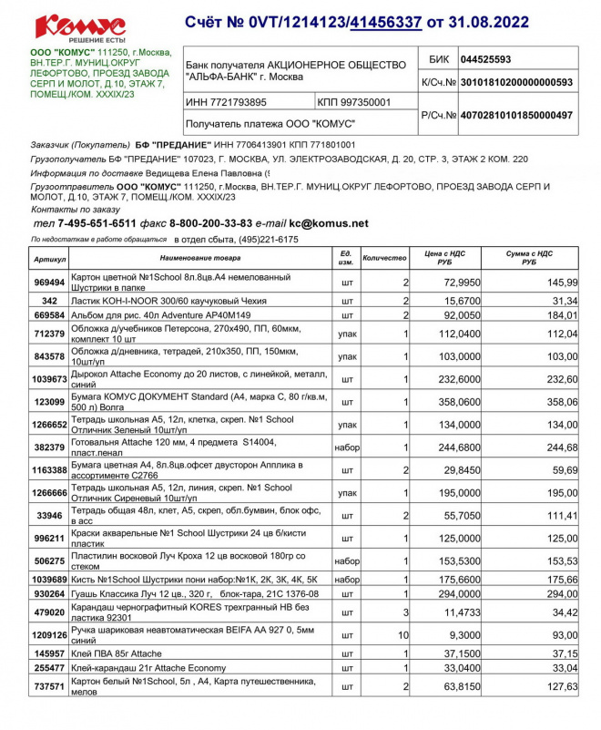 Оплачена покупка школьных товаров ребенку-инвалиду Артёму Ведищеву