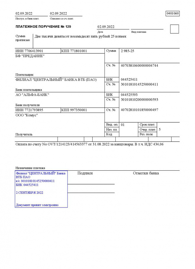 Пожертвование согласно ст.582 ГК РФ. Без налога (НДС)