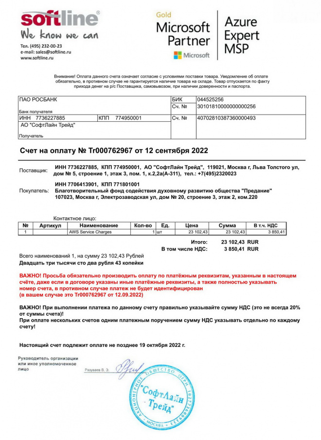 Оплачен счет за размещение видеоматериалов в "облачном сервисе" в сентябре 2022 г.