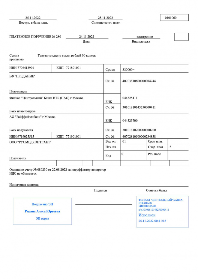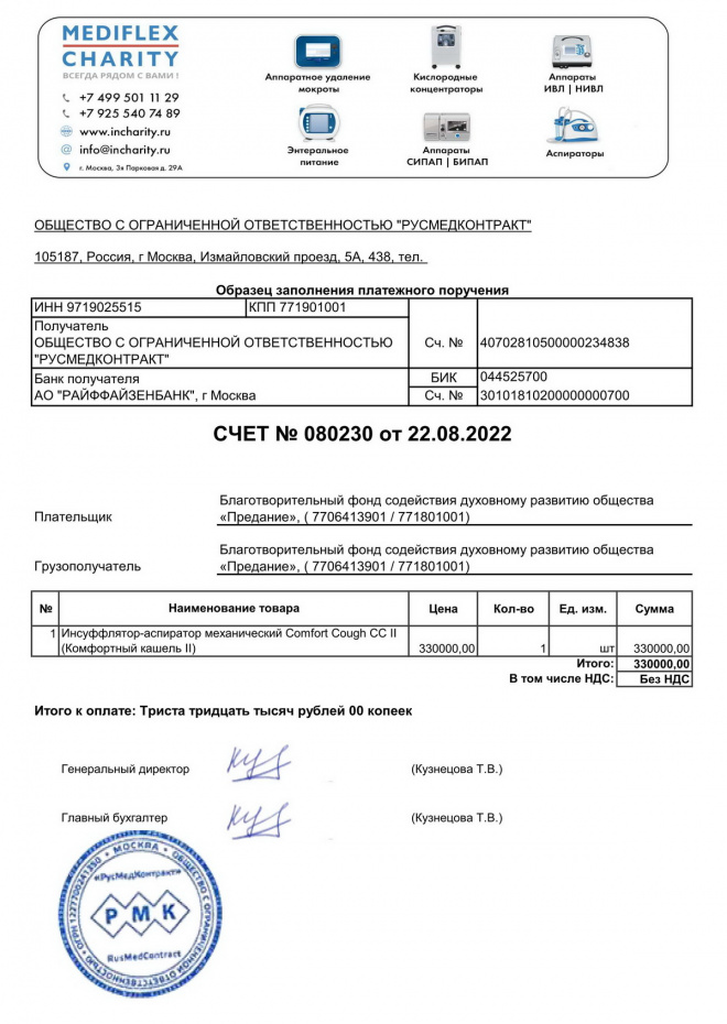 Пожертвование согласно ст.582 ГК РФ. Без налога (НДС)