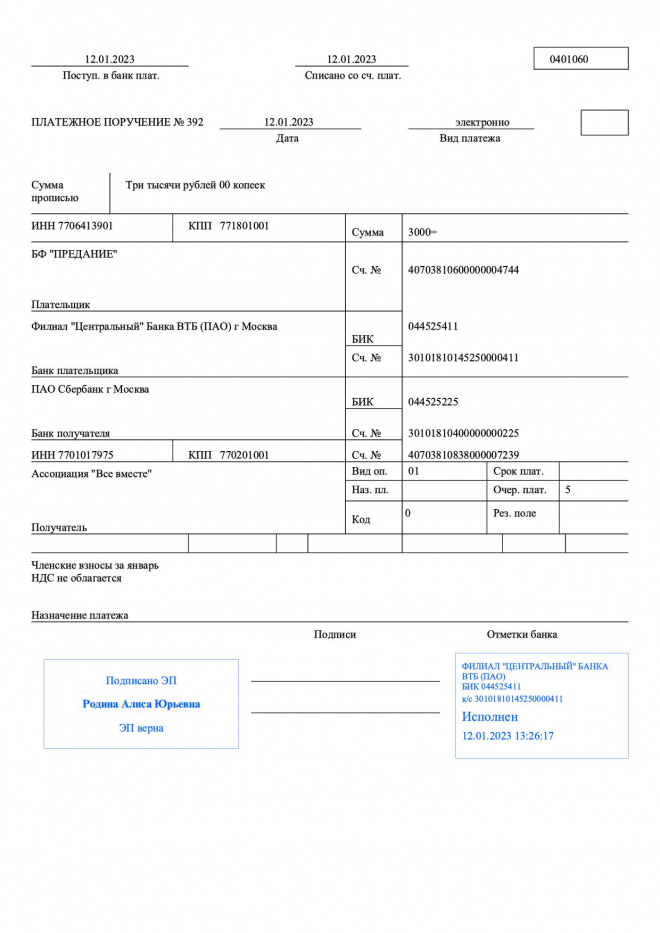 Перечислены членские взносы за январь 2023 года в благотворительное собрание "Все вместе"