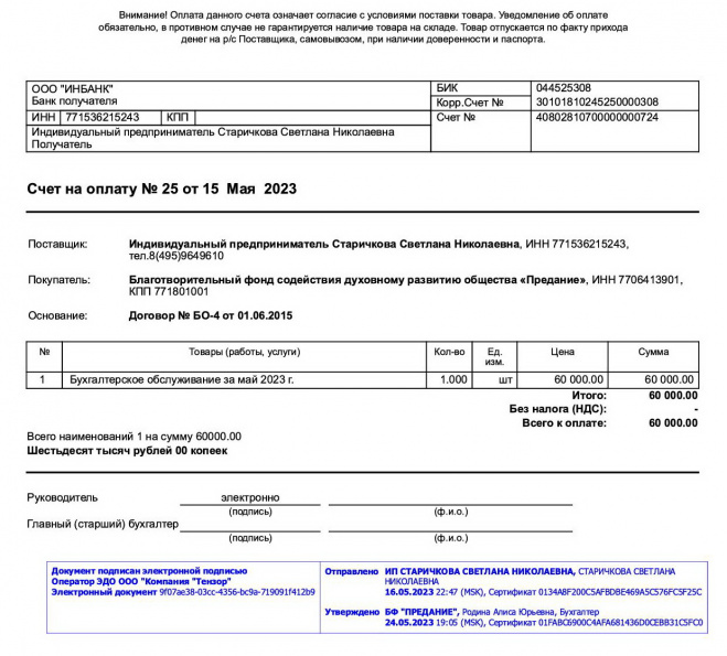 Оплачен счет за бухгалтерское обслуживание портала "Предание" в мае 2023 г.