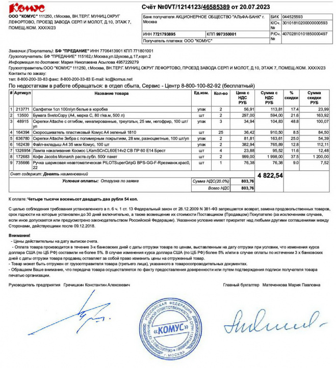 Оплачена покупка питьевой воды, канцелярских и хозяйственных товаров для нашего офиса